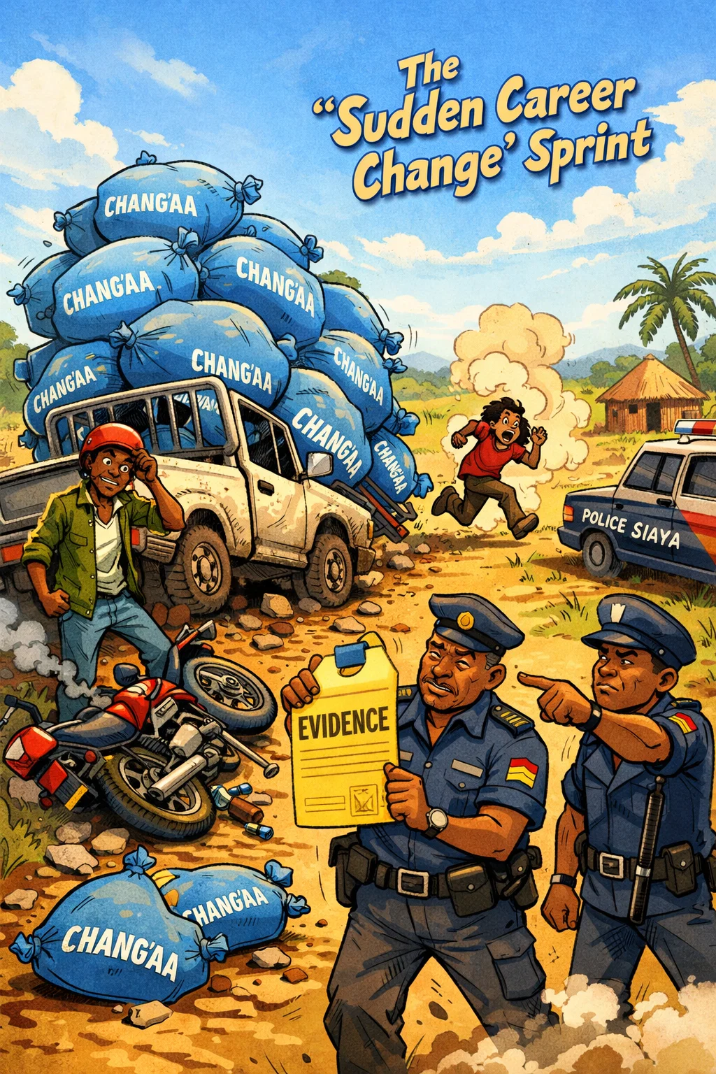 In a classic case of “Too Much Cargo, Too Little Brake,” a driver transporting enough chang’aa to power a small rocket ship collided with a motorcycle. Realizing that explaining 990 litres of “liquid fire” to a traffic cop is harder than passing a bar exam, the driver opted for the legendary “Olympic Sprint,” fleeing the scene on foot.